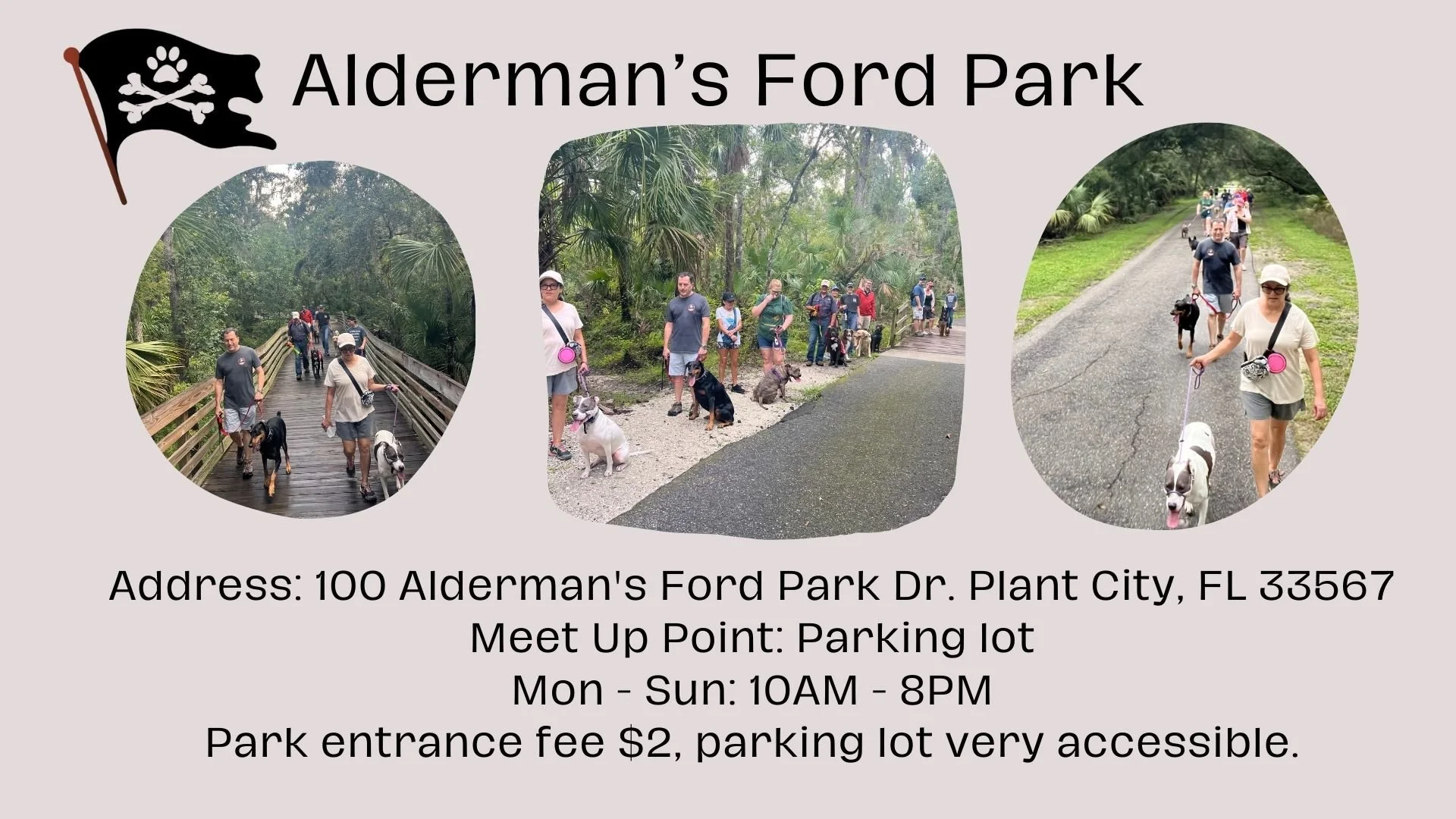 This month’s pack walk is Sunday 3/29 @10:00am at Alderman’s Ford Park. Location address is 100 Alderman’s Ford Park Dr. Plant City, FL 33567. We will be meeting near the parking lot. This event is free and open for any group class or private lesson alumni, though please be advised there is a $2 park entrance fee. Please bring a leash and training collar that gives you control and that your pet cannot escape from. I will do a gear check to make sure your pup cannot escape their leashes and collars. Remember to also bring poop bags and water for both you and for your pup.